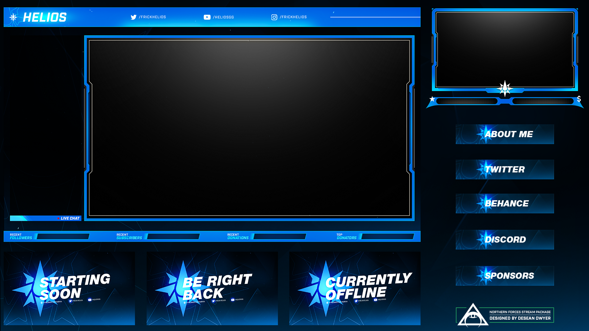 Helios is a rapidly growing Twitch streamer from Canada. He regularly produces content on Fortnite and Overwatch. Recently joining Northern Forces, a multi-media gaming organization with 20,000 followers, he contacted me in need of a serious upgrade across his social media.
